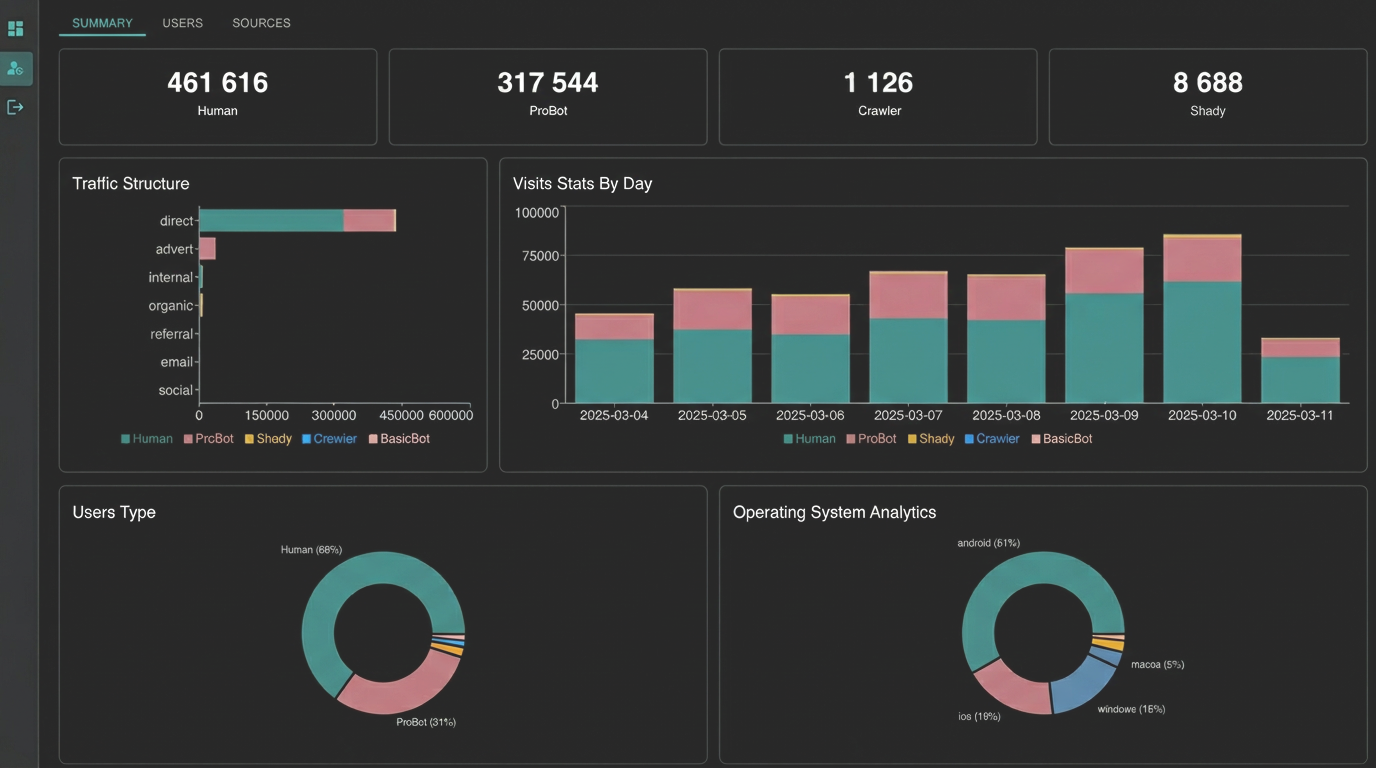 View instant insights. Within hours, access a dashboard with classified visits, traffic structure, user types, sources, campaigns, and more.